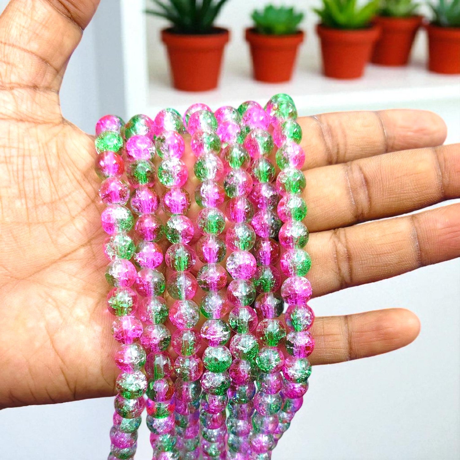 Elevate your beadwork with these 8mm crackle beads in striking green and pink hues. The distinctive crackle finish creates dimensional texture and light-catching appeal, making each bead a standout element in jewelry designs, embellishments, and craft projects. Their versatile size works seamlessly with standard beading techniques and stringing materials. Perfect for artisans seeking to add visual interest and depth to handmade pieces, these beads deliver professional-quality results whether you're creating statement necklaces, bracelets, or mixed-media designs.