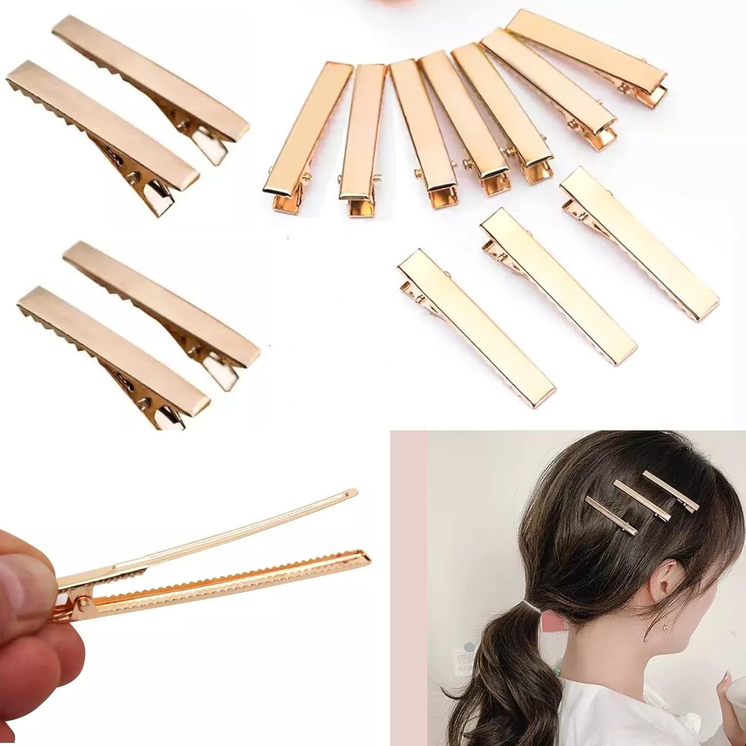 These gold-colored alligator hair clips, each measuring 4.5 cm, provide a secure hold for various hair types and styles. Sold in packs of five, they are ideal for both everyday use and professional styling. Their sturdy grip ensures reliable performance without slipping, making them a practical choice for precise hair sectioning and effortless styling.